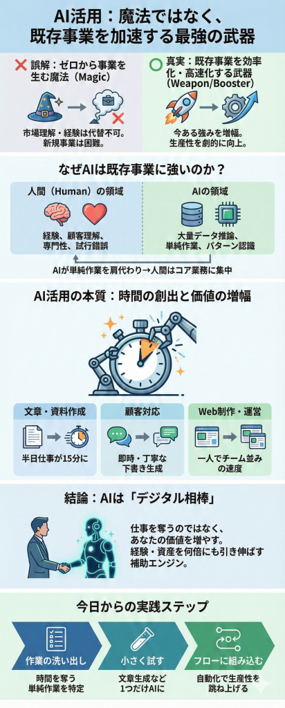 AI活用は“ゼロから事業を作る魔法”ではなく、既存のサービスを効率化・高速化するための武器である